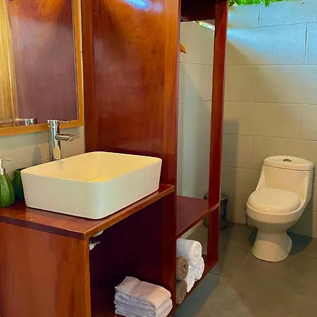 Cette propriété de La Fortuna présente une salle de bains avec une douche ouverte, une baignoire spa et une toilette séparée. Un sèche-cheveux et des draps de bain sont également disponibles pour le confort des clients.
